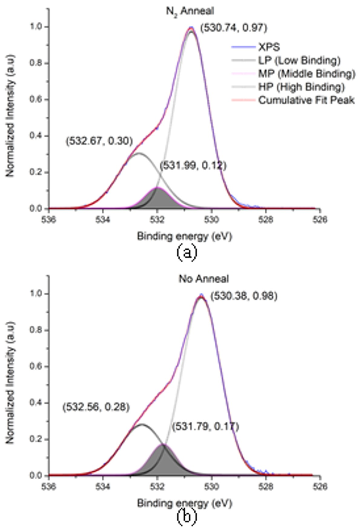 To analyze oxygen vacancy change depending on N2 anneal process, XPS measurement was fulfilled at the Al2O3 samples as shown in Fig. 6 and Table 2. The O1s peaks are classified as the low binding energy (LP), middle binding energy