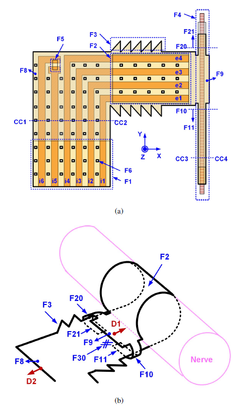nerve. Fig. 2(a) presents the top-view layout of the thin, flexible electrode. The electrode consists