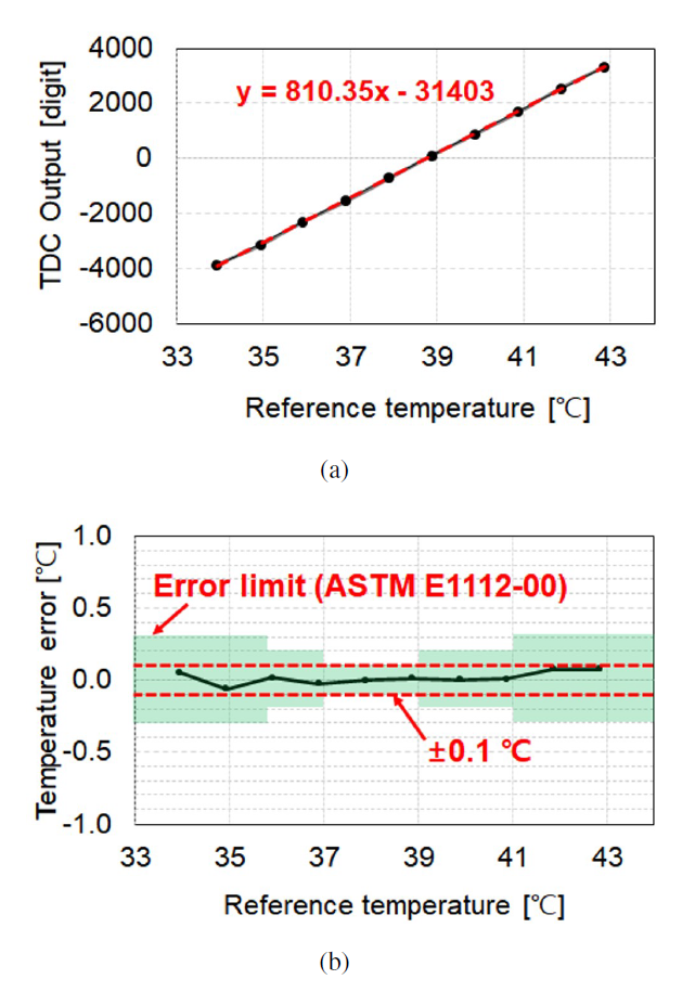 exhibited high linearity (R2 = 0.998) and sensitivity (810.35 digits/$^\circ$C) across 34-43 $^\circ$C, with errors