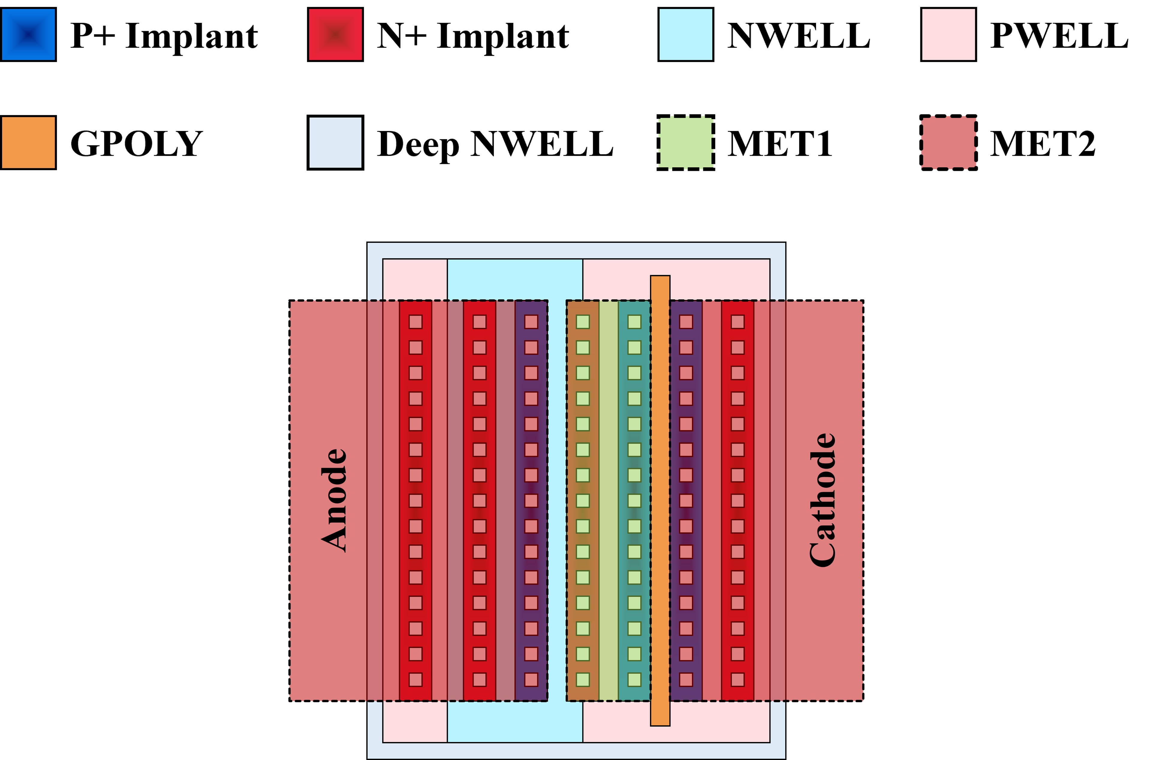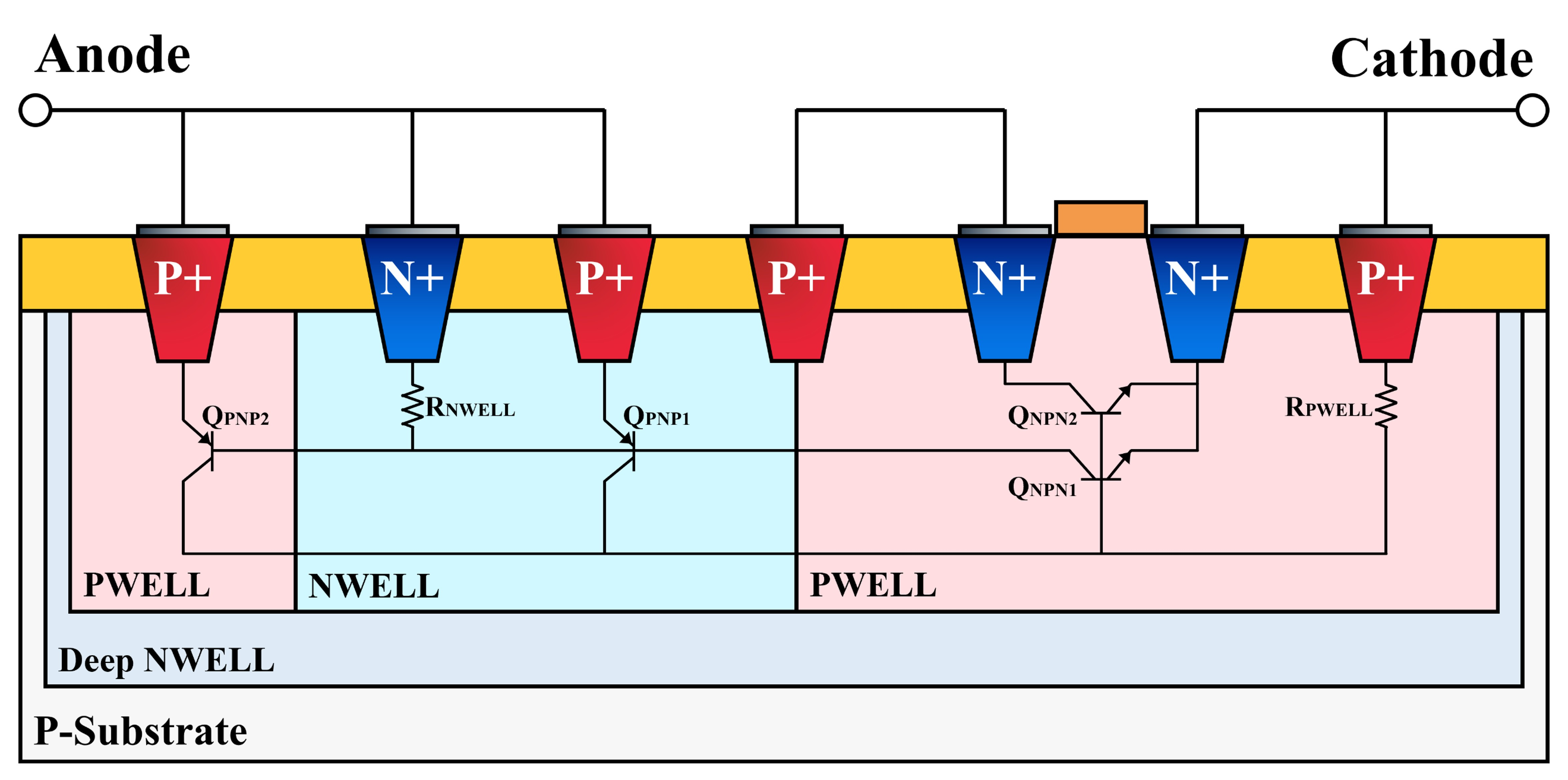 similar to the LVTSCR, incorporates a heavily doped P+ region between the wells to lower the trigger voltage and introduces an additional