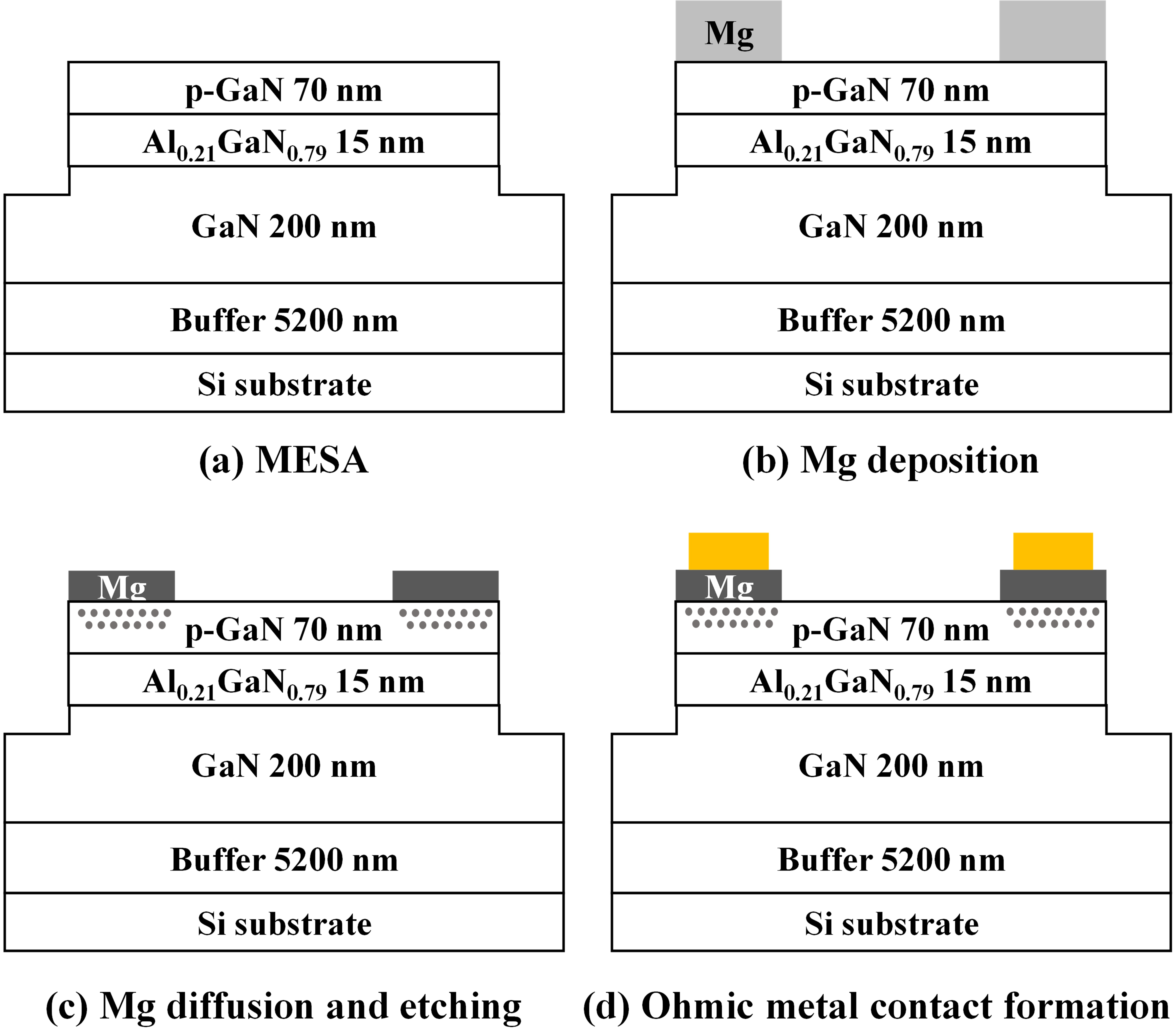 Figs. 1(a)-(d) schematically illustrate the fabrication process of the p-type GaN ohmic contact.