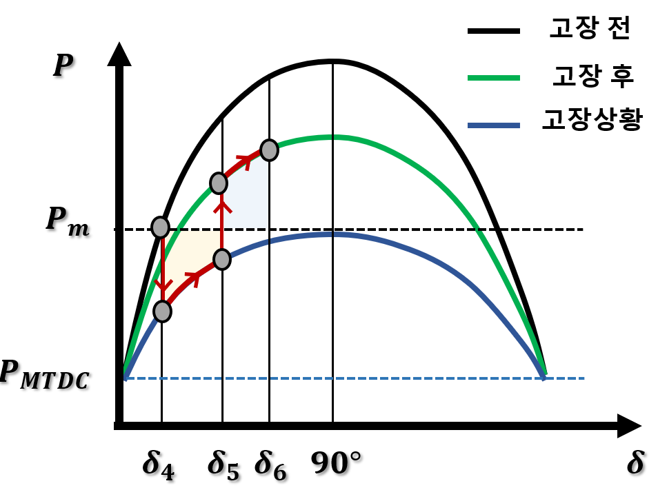 그림 7의 하이브리드 AC/DC 계통의 경우 상술한 바와 같이 수식 (1)에 따라 그림 6의 AC 망 P-δ 커브를 MTDC 출력만큼 평행이동한 그래프를 띈다. 각 그림의 노란색 영역은 회전자 가속 영역, 푸른색 영역은 회전자 감속 영역을