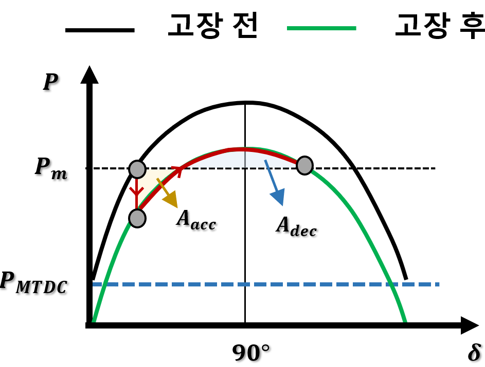 나타내며, 고장 시 회전자 가속영역이 감속영역의 면적을 초과할 시, 동기발전기의 회전자가 빠르게 가속하여 탈조될 수 있다. 위 그림 6, 7에서 볼 수 있듯이 같은 계통 운전점에서 AC 선로 고장에 따른 회전자 가속 영역의 면적이 줄어들어 과도안정도가 향상됨을 확인할 수 있다. 이는