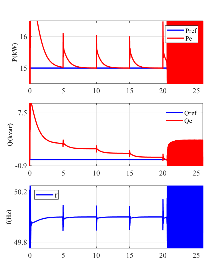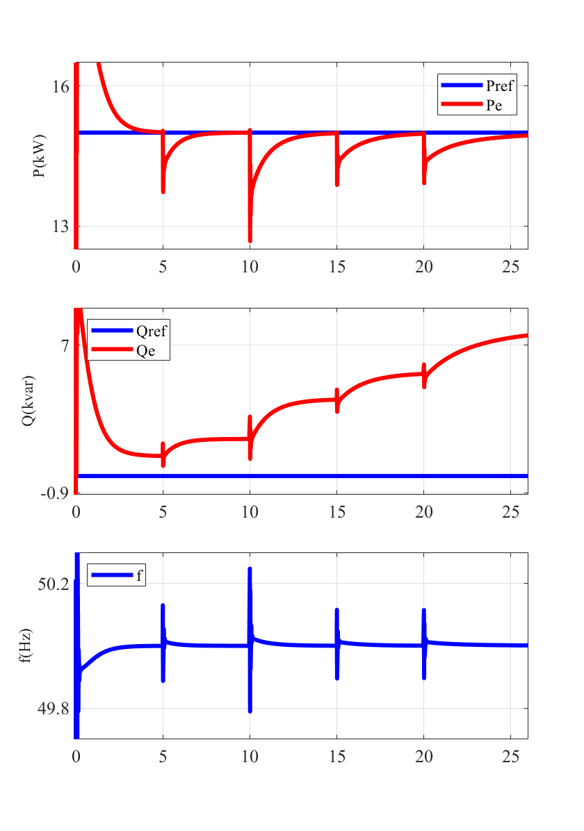 시간에 따라 변화시키며, 지령값과 측정된 유효 전력, 지령값과 측정된 무효 전력, 그리고 주파수 파형을 측정하였고 모의 결과는 그림 4에 나타내었다. 모의가 진행되는 동안 유효 전력 지령값은 15 kW로 고정되었고, 무효 전력 지령값은 0 Var로 설정되었다. 계통 임피던스는 매