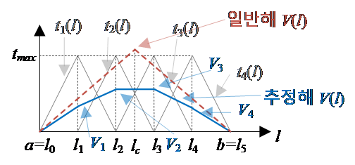 μλ΅(μλ₯Ό λ€μ΄, μ μ $V(l)$)λ₯Ό μ°ΎκΈ° μν μ ν μμλ²μ μ€κ³νκΈ° μν΄μ λ€μ κ·Έλ¦Ό 2μ κ°μ 1μ°¨μ μΌκ°ν μμλ§ ν¨μλ₯Ό κ°μ νμλ€(ν¨μ $t_{1}$, $t_{2}$, $t_{3}$, $t_{4}$). μ¦, μμμ(Subdomain)μμ