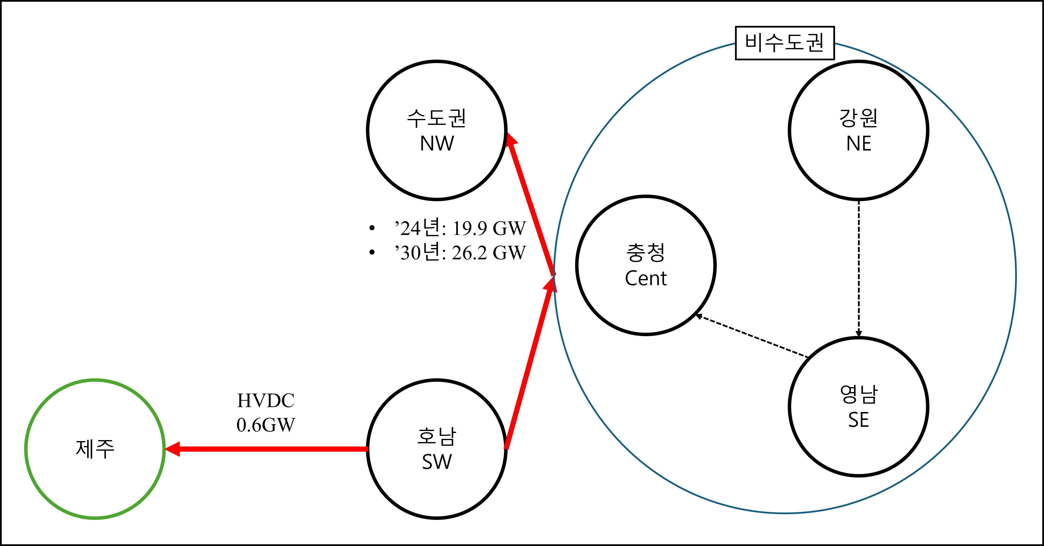따라서 그림 2와 같이 향후 재생에너지 설치가 계속 증가하여 전원구성에서의 비중이 커질 시[3], 재생에너지 출력제어가 과도하게 발생할 수 있으며 화력 발전기의 출력 감발뿐만 아니라 원자력 발전기의 정지가 필요할 수도 있다.