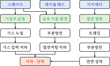열화 메커니즘은 GIS의 구조에 따라 부품별로 분류하였으며, 부품은 청색, 지배적인 열화 요인은 녹색, 열화의 결과는 적색으로 표기하였다. 부품별