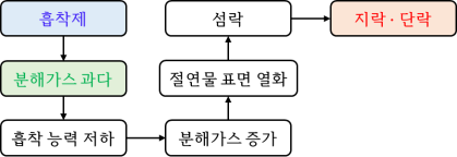 그림 14는 주회로부를 구성하는 흡착제의 열화 메커니즘을 나타낸다. 흡착제는 수분 및 분해가스 흡착을 위해 사용되며, 흡착제의 흡착 용량이 초과되는 경우에는