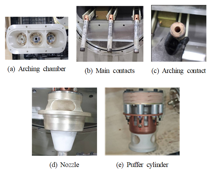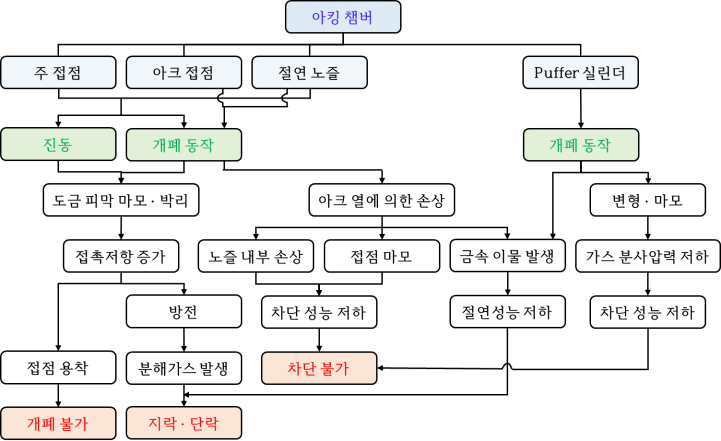 그림 15는 차단기구부를 구성하는 아킹 챔버의 열화 메커니즘을 나타낸다. 그림 16에 나타낸 것과 같이 아킹 챔버는 전류 통전을 위한 주 접점, 아크로부터 주 접점을 보호하기 위한 아크 접점, 아크의 원활한 소멸을 위한 절연 노즐,