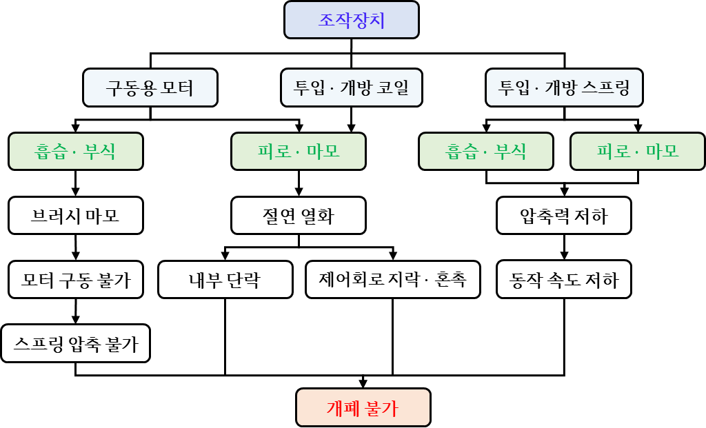 그림 17은 차단기구부를 구성하는 조작장치의 열화 메커니즘을 나타낸다. 조작장치는 차단기에 조작력을 제공하는 부품으로서 조작용 모터, 투입·개방 코일, 투입·개방