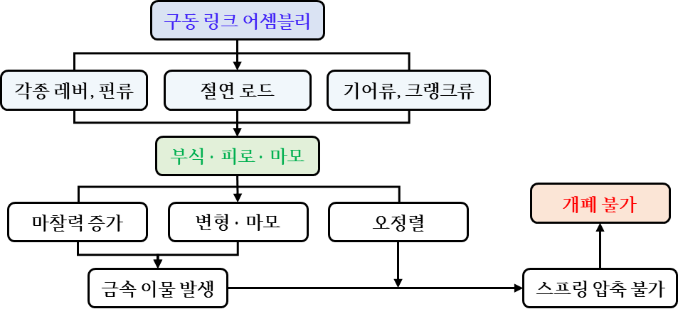 이물과 오정렬을 발생시키고, 스프링 압축 불가로 이어져 종국에는 개폐 불가를 초래할 수 있다. 구동 링크 어셈블리의 열화 특성은 조작장치와 마찬가지로