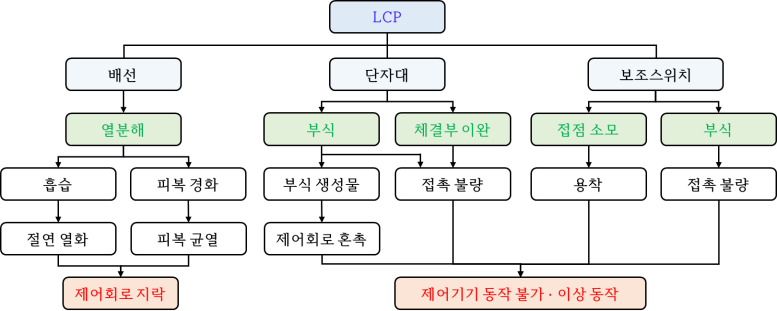 관리 등급으로는 2등급을 부여하였다. 그림 23은 제어기구부를 구성하는 LCP의 열화 메커니즘을 나타낸다. LCP는 배선, 단자대, 보조스위치로 구성되며, GIS는 이를 통해 원격 감시반으로부터