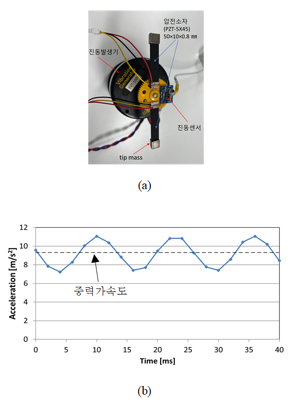 그림 3. (a) 직렬 연결된 압전 소자로 구성된 진동 에너지 하베스터 (b) 진동 발생기의 출력 진동 세기 측정