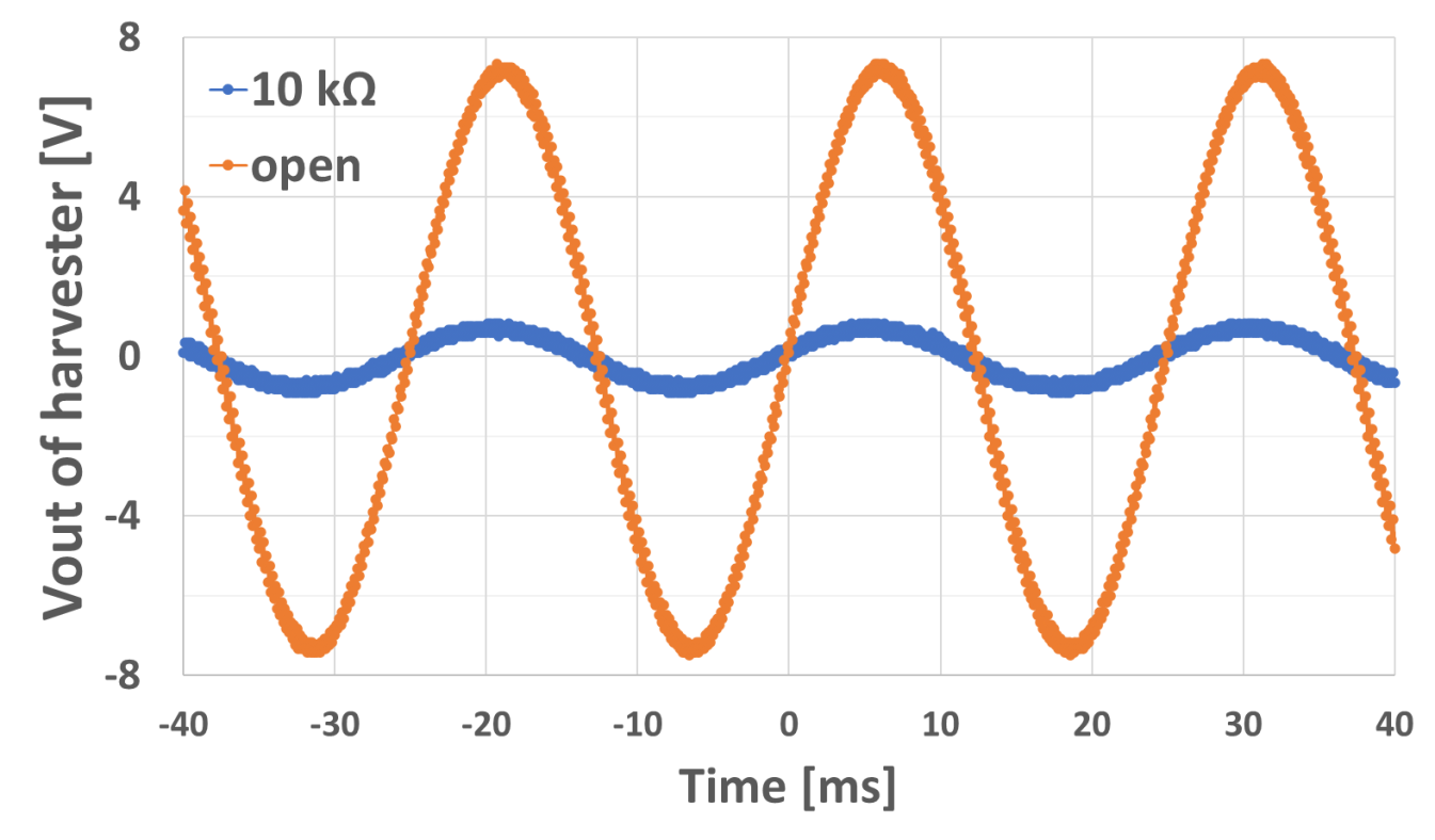 출력은 나중에 본 연구 결과로 구현될 자가 전원 무선 센싱 시스템의 에너지 수집 성능과 비교되어 논의될 예정이다.