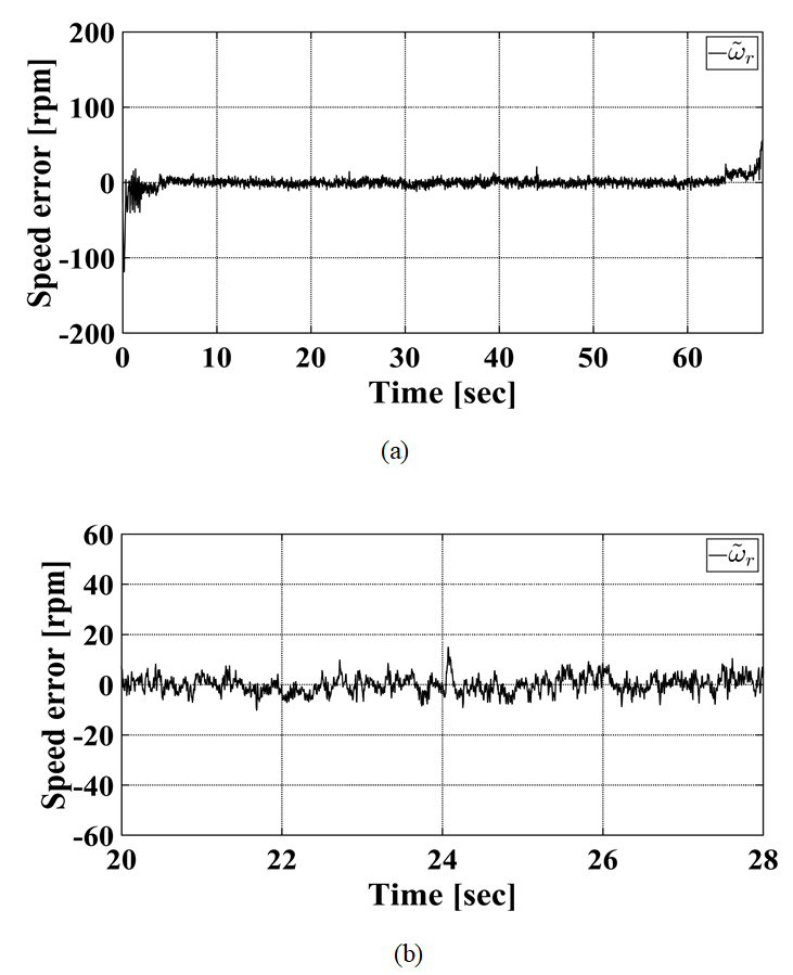 나타낸다. 그림 8(a)는 전체 실험 시간 동안의 속도 오차, 그림 8(b)는 정격 부하의 30%를 인가하였을 때의 속도 오차이다. 영속도 부근에서 자속 추정이 어려워 속도 오차가 120rpm까지 커졌으나, 이는 빠르게 줄어들어
