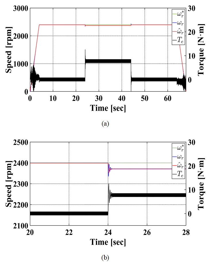 그림 7은 정격 부하의 30% 인가 시 실험 결과를 나타낸다. 그림 7(a)는 전체 실험 시간 동안 회전자 속도 및 토크 응답이며, 그림 7(b)는 정격 부하의 30\%를 인가하였을 때의 회전자 속도 및 토크 응답, 그림 7(c)는 추정 자속이다. 그림에서 녹색은 지령 회전자 속도, 청색은 실제 회전자 속도, 적색은 추정 회전자 속도, 흑색은 부하 토크를 나타낸다. 그림 7(a)를 통해 전 구간에서 추정 속도가 전반적으로 실제 속도를 추정함을 확인할 수 있으며, 그림 7(b), 그림 7(c)를 통해 부하가 급격히 변화하는 상황에서도 속도 및 자속을 안정적으로 추정함을 확인할 수 있다.