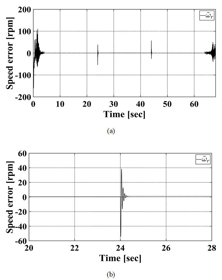 (a)는 전체 실험 시간 동안의 속도 오차, (b)는 정격 부하의 50\%를 인가하였을 때의 속도 오차이다. 정격 부하가 50%로 증가해도 30%를