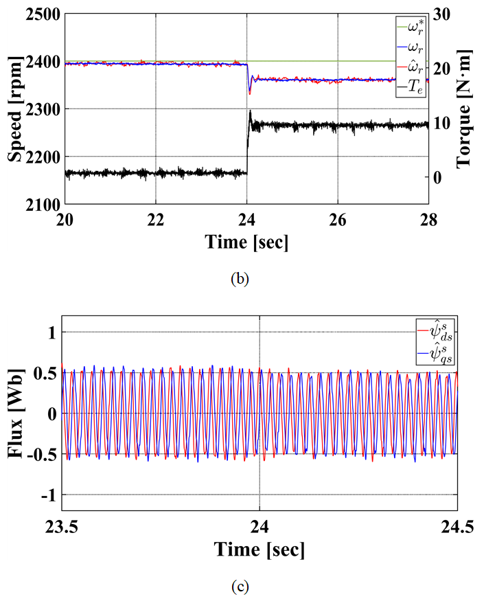 그림 9는 정격 부하의 50%를 인가하였을 때의 실험 결과를 나타낸다. 그림 9(a)는 전체 실험 시간 동안의 회전자 속도 및 토크 응답이며, 그림 9(b)는 정격 부하의 50%를 인가하였을 때의 회전자 속도 및 토크 응답, 그림 9(c)는 추정 자속이다. 그림 9(a)를 통해 부하가 30%에서 50%로 더 커졌음에도 전 구간에서 안정적으로 속도를 추정함을 확인할 수 있으며, 그림 9(b), 그림 9(c)를 통해 부하가 더 급격히 변화하는 상황에서도 여전히 속도 및 자속을 안정적으로 추정함을 확인할 수 있다.