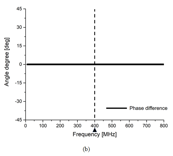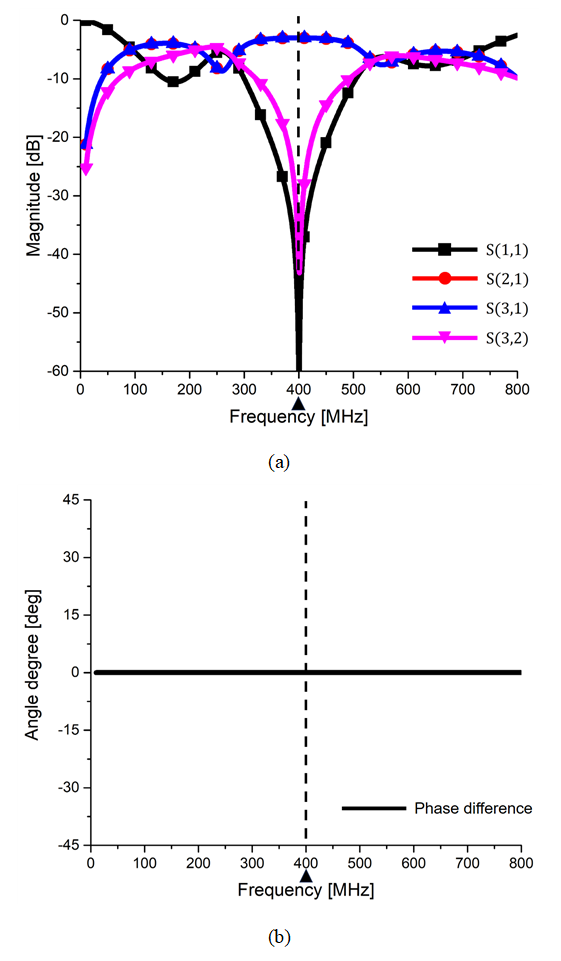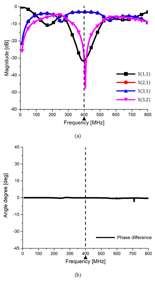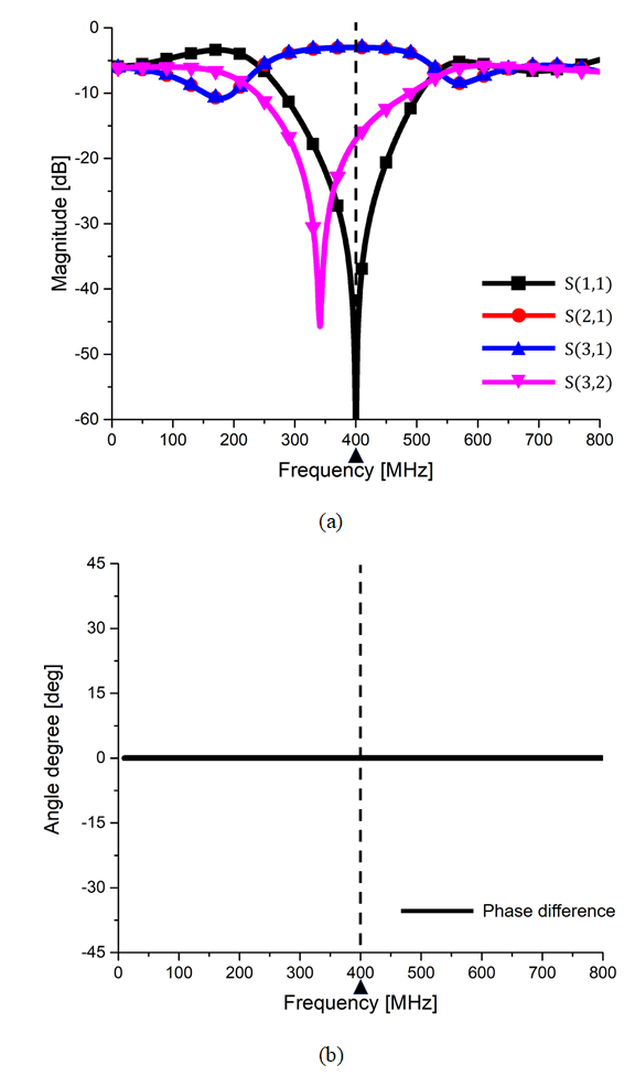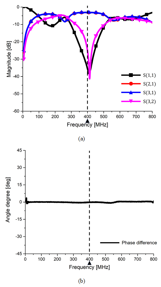 그림 13. 그림 11의 EM 시뮬레이션 결과 (a) S-parameter (b) 출력포트 간의 위상차