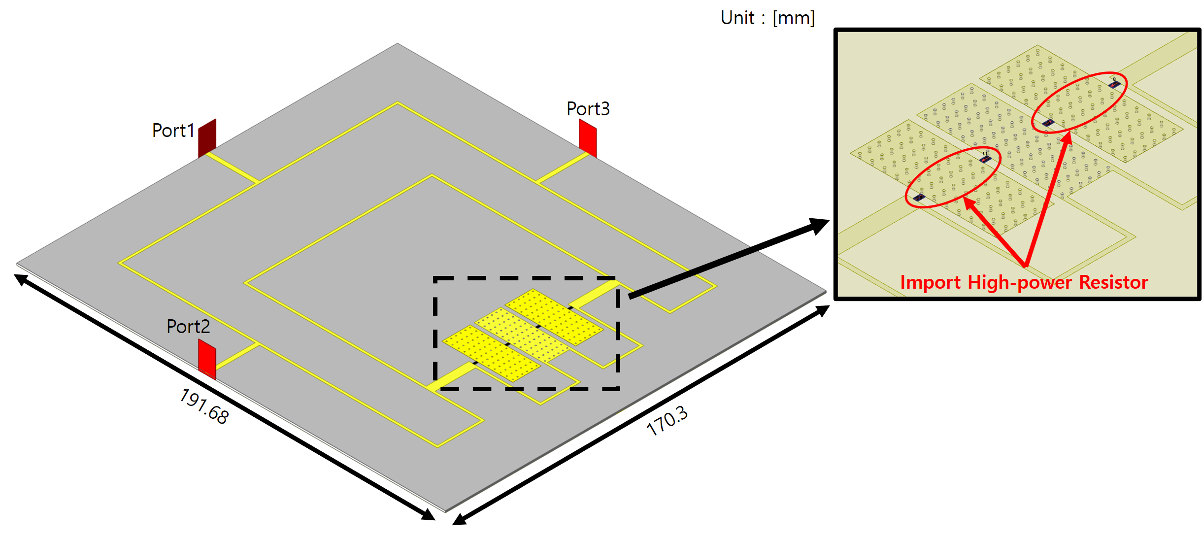그림 12. EM 시뮬레이션을 통해 고전력 저항 특성을 반영한 기판