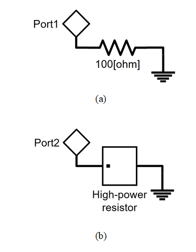 추출한 고전력 저항과 이상적인 100[Ω] 저항의 동작 특성을 비교ㆍ분석하기 위해 그림 2와 같이 각각의 저항을 접지된 형태로 회로를 구성하였다. 그림 3은 그림 2에 도시한 회로들의 특성을 분석하기 위한 정규화된 임피던스이다. 그림 3(a)는 그림 2(a)의 회로에서 Port1에 대한 $S_{11}$이고 그림 3(b)는 그림 2(b)의 회로에서 Port2에 대한 $S_{22}$이다. 본 논문에서의 회로 시뮬레이션은 ANSYS 사의 Circuit과 Keysight 사의 ADS를