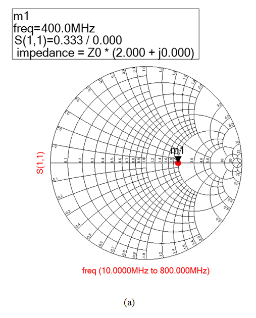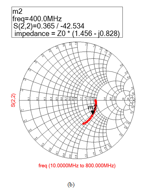 주파수 400[MHz]에서 이상적인 저항의 경우, 그림 3(a)에서와 같이 2+j0[Ω]의 값을 가진다. 반면에, 고전력 저항의 경우, 그림 3(b)에서와 같이 1.456–j0.828[Ω]의 값을 가진다. 이를 통해 고전력 저항은 이상적인 저항과 같이 동작하지 않고 기생 성분의 영향을 받아 복합