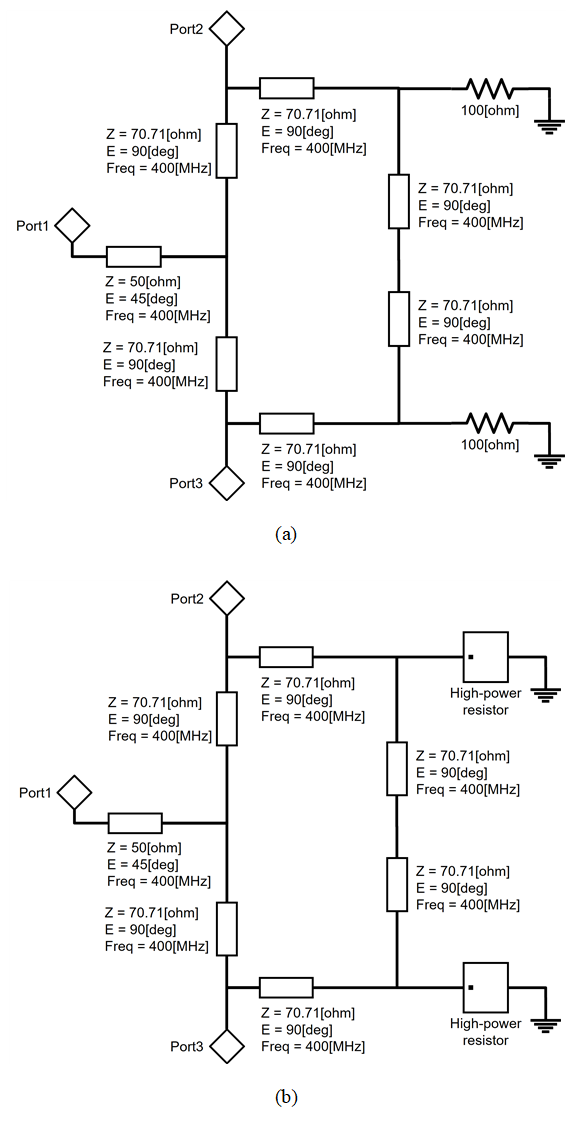 그림 4. 각각의 저항으로 구성한 이상적인 가이젤 전력 분배기 (a) 이상적인 저항 (b) 고전력 저항