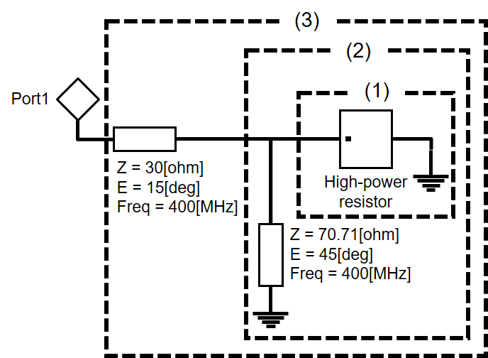 그림 7에는 임피던스 정합 과정의 각 단계를 시각적으로 표현하였으며, 그림 7에서 (1)은 보상 이전의 접지된 고전력 저항 단독 구조를, (2)는 여기에 Short stub을 병렬로 추가한 구조를, (3)은 직렬의 전송선로까지