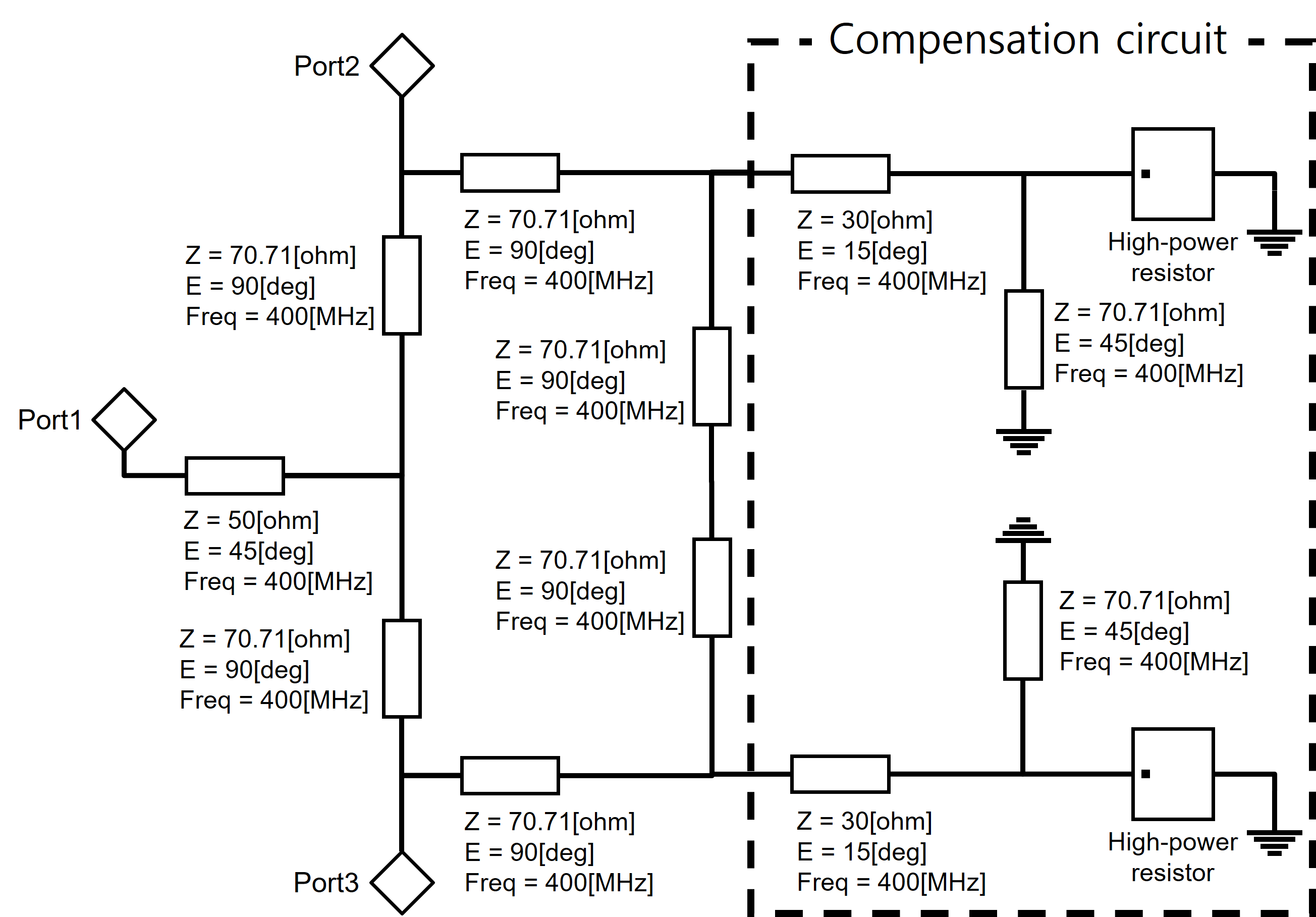 Gysel power divider, High-power resistor, Parasitic component, Compensation circuit, Impedance matching
