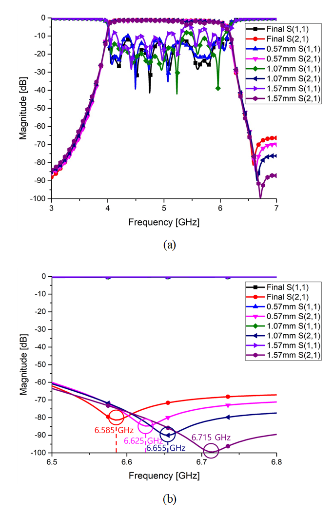 ํต๊ณผ๋์ญ์ ๋ณํ๋ ์์ง๋ง transmission zero์ ์ง์ ์ด ์ด๋ํ๋ ๊ฒ์ ๋ณผ ์ ์๋ค. ๋์ด๊ฐ 2.4 mm์ธ ๊ฒฝ์ฐ 6505 MHz, 3.4