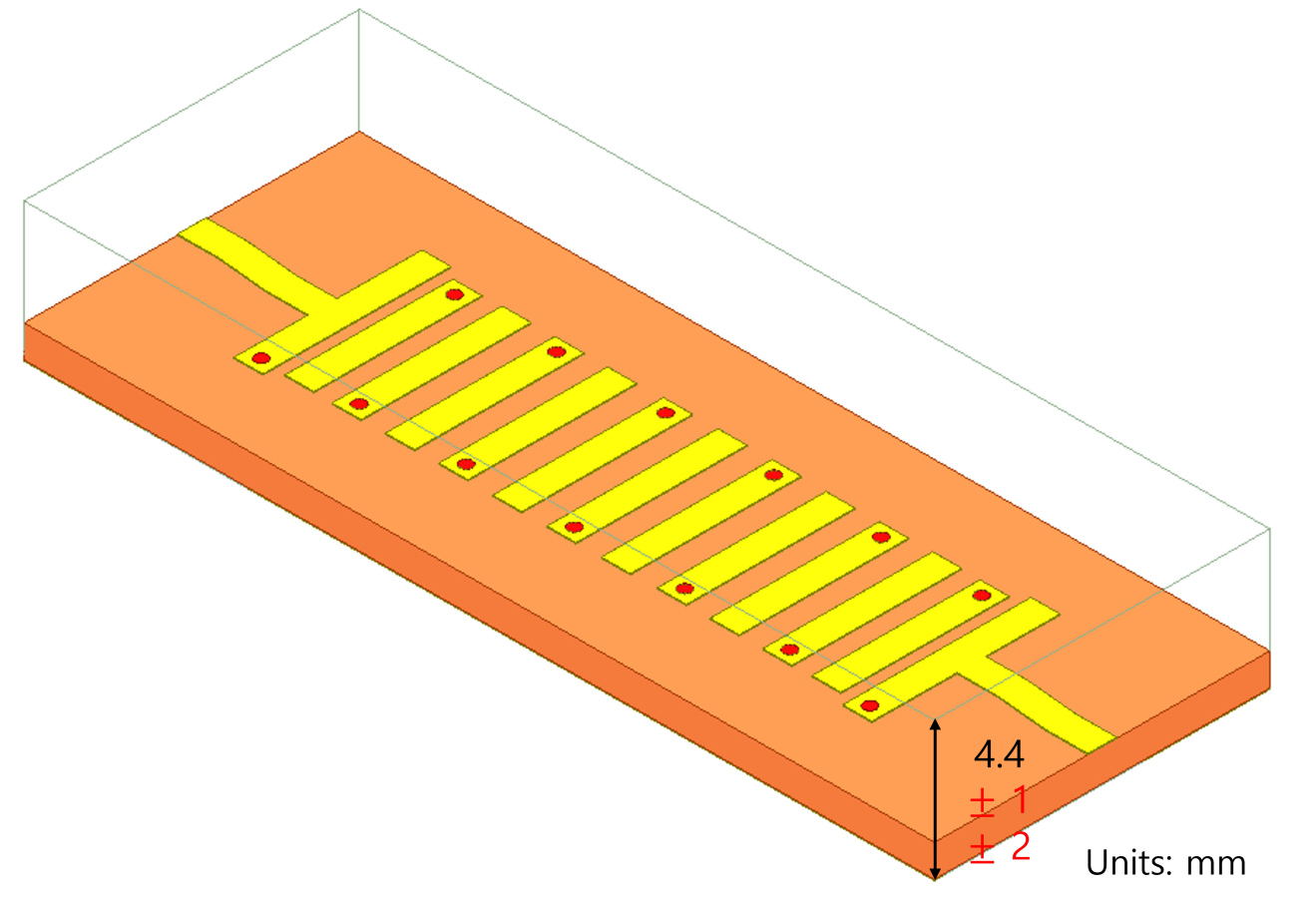 ๋ ๋ค๋ฅธ ๋ฐฉ๋ฒ์ผ๋ก transmission zero ์ง์ ์ ์ด๋์ํค๋ ๋ฐฉ๋ฒ์ cover์ ๋์ด๋ฅผ ๋ณํํ๋ ๋ฐฉ๋ฒ์ด ์๋ค. ๊ทธ๋ฆผ 11์ PCB(printed circuit board)์ cover๋ฅผ ํฌํจํ ๋์ด๋ 4.4 mm๋ก ์ฌ๊ธฐ์ ๋์ด๋ฅผ ์กฐ์ ํ์ฌ transmission zero์