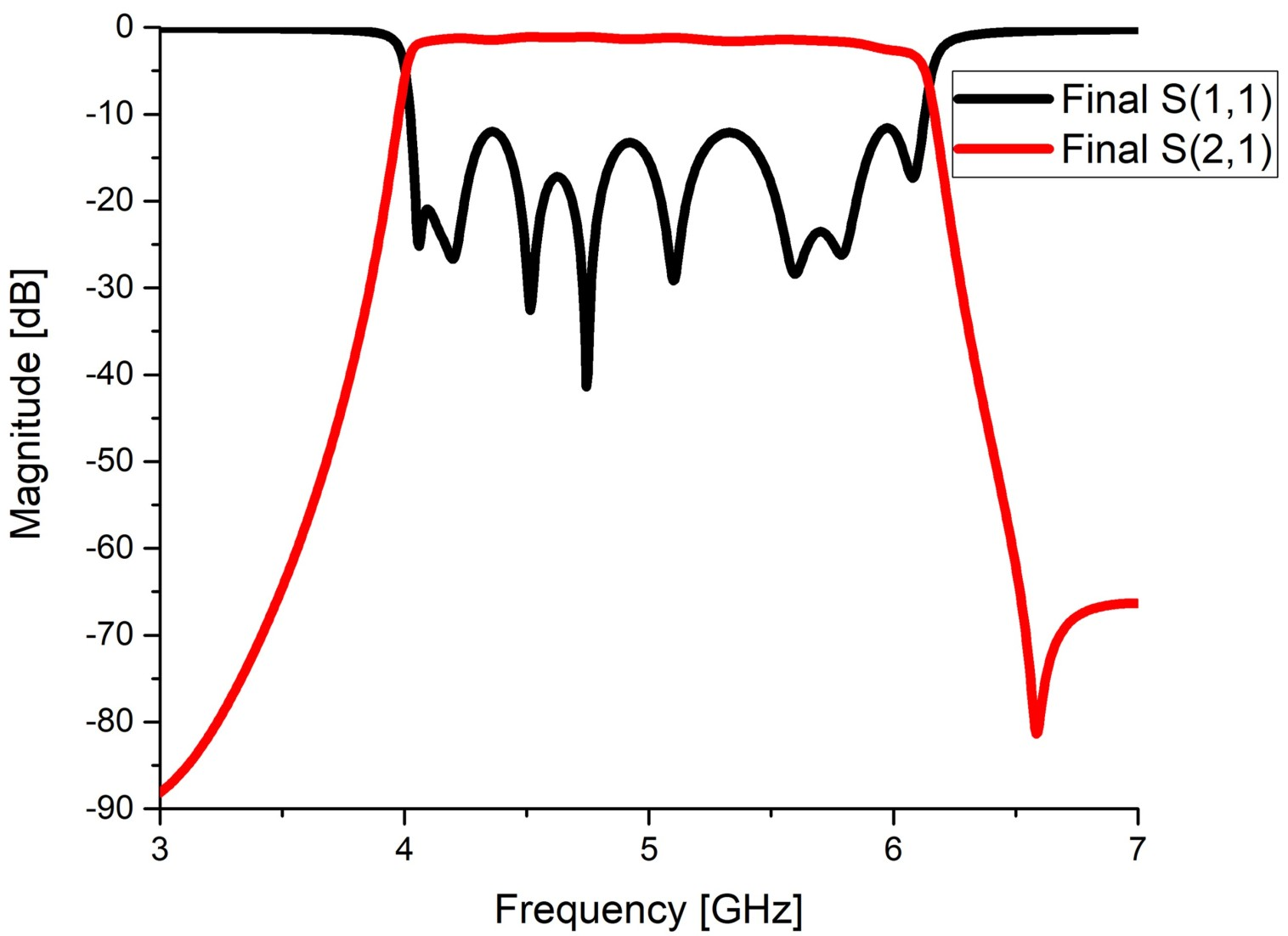 ๊ทธ๋ฆผ 7์ ๊ธฐ์กด์ ์ค๊ณ๋ Final๊ณผ ๊ทธ๋ฆผ 9์ ๋ณํ๋ ๊ตฌ์กฐ๋ฅผ ๊ฐ์ง ๊ทธ๋ฆผ 9์ ํน์ฑ์ ๋น๊ตํ ํ์ด๋ค. ๊ทธ๋ฆผ 10์ ํน์ฑ์ ๋ณด๋ฉด pass band์ bandwidth๋ ๊ฐ์ ๋ชจ์ต์ ๋ณผ ์ ์๊ณ transmission zero๋ ๊ณ ์ฃผํ๋ก ์ด๋ํ ๋ชจ์ต์ ๋ณด์ธ๋ค.