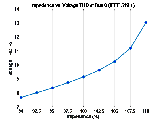 Fig. 6. Variation of voltage THD with impedance based on IEEE 519 (120V~69kV)