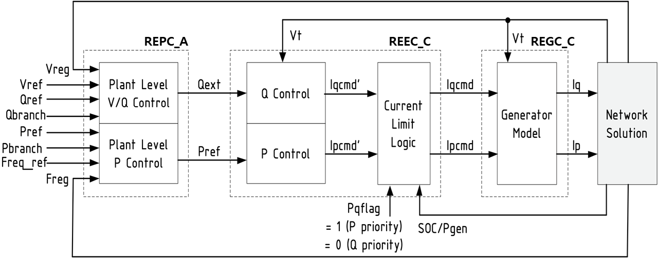 PV IBRs는 PLL을 통해 계통과 동기화 되는데 dq축 전류 제어를 통해 유무효 전력과 입출력을 제어한다. 그림 4는 일반적인 Single Stage PV IBR의 구조로 d축 전류 지령치는 MPPT/DC-Link 제어기를 통해, q축 전류 지령치는 무효전력 제어기로부터
