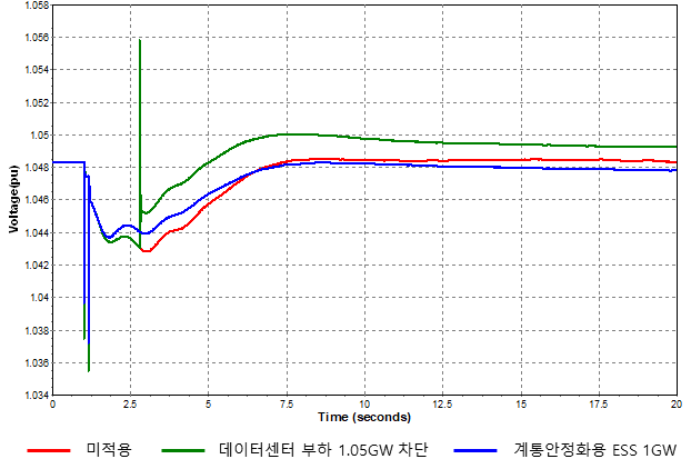따라 3GW 발전기(신한울1, 2호기)가 탈락하는 상정고장을 적용한다. 또한, 데이터센터 부하 차단 효과를 비교하기 위해 기존 계통 안정화용 ESS