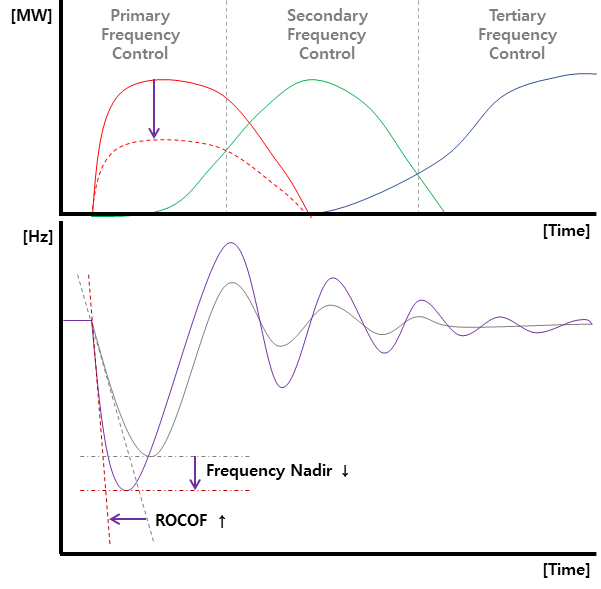 이하 ROCOF)의 증가로 UFR 동작치에 빠르게 도달할 수 있으며, 동시에 최저주파수 (Frequency Nadir)가 낮아질 수 있다[7]. 이러한 관성부족 현상은 계통주파수를 정상화 하기 위해 1, 2차 주파수 복구 구간에서 더 많은 보조서비스가 필요할 수 있다[8].