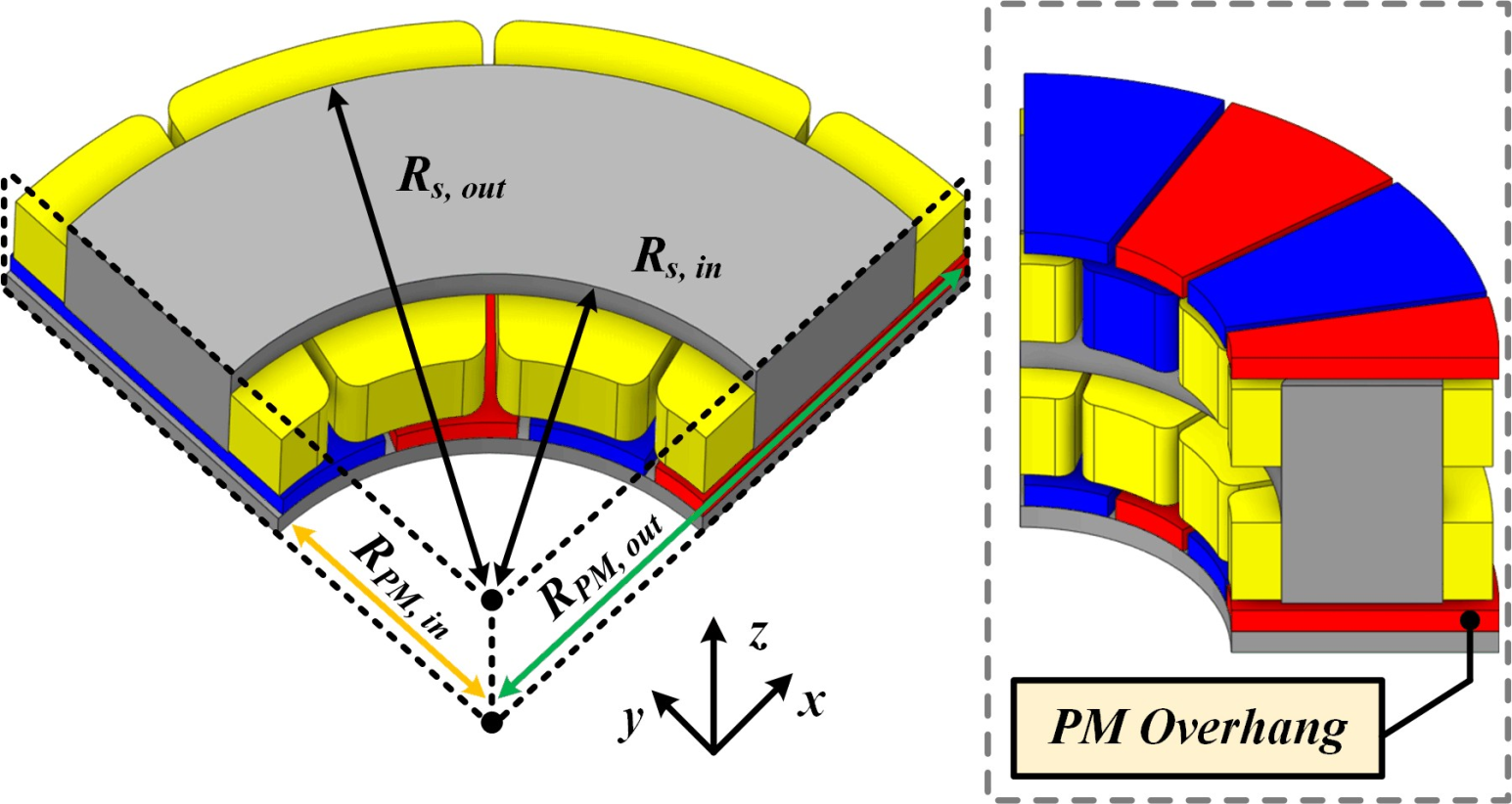 높은 수준의 해석 정확도를 확보할 수 있어 널리 적용되고 있다[9-10]. 그러나 기존 Quasi-3D 방법은 회전자 및 영구자석이 고정자보다 돌출된 오버행(Overhang) 구조에서는 적용에 한계가 있다. 특히 AFPM에