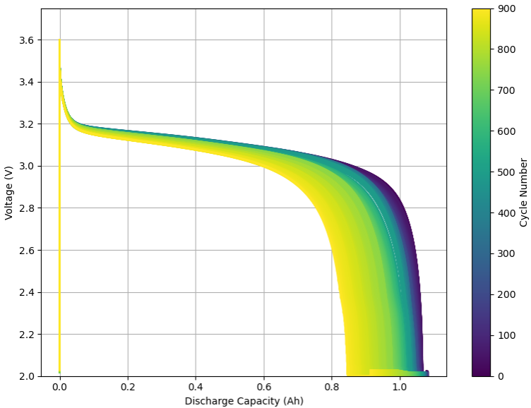 ๋ฃ ์์ ๊น์ง์ ์ ์ ๋ณํ๋ฅผ ์๊ณ์ด๋ก ๋ํ๋ด๋ฉฐ, ์ด๋ ๋ฐฐํฐ๋ฆฌ์ ๋ด๋ถ ์ํ ๋ฐ ์ดํ ์ ๋๋ฅผ ๋ฐ์ํ๋ ์ค์ํ