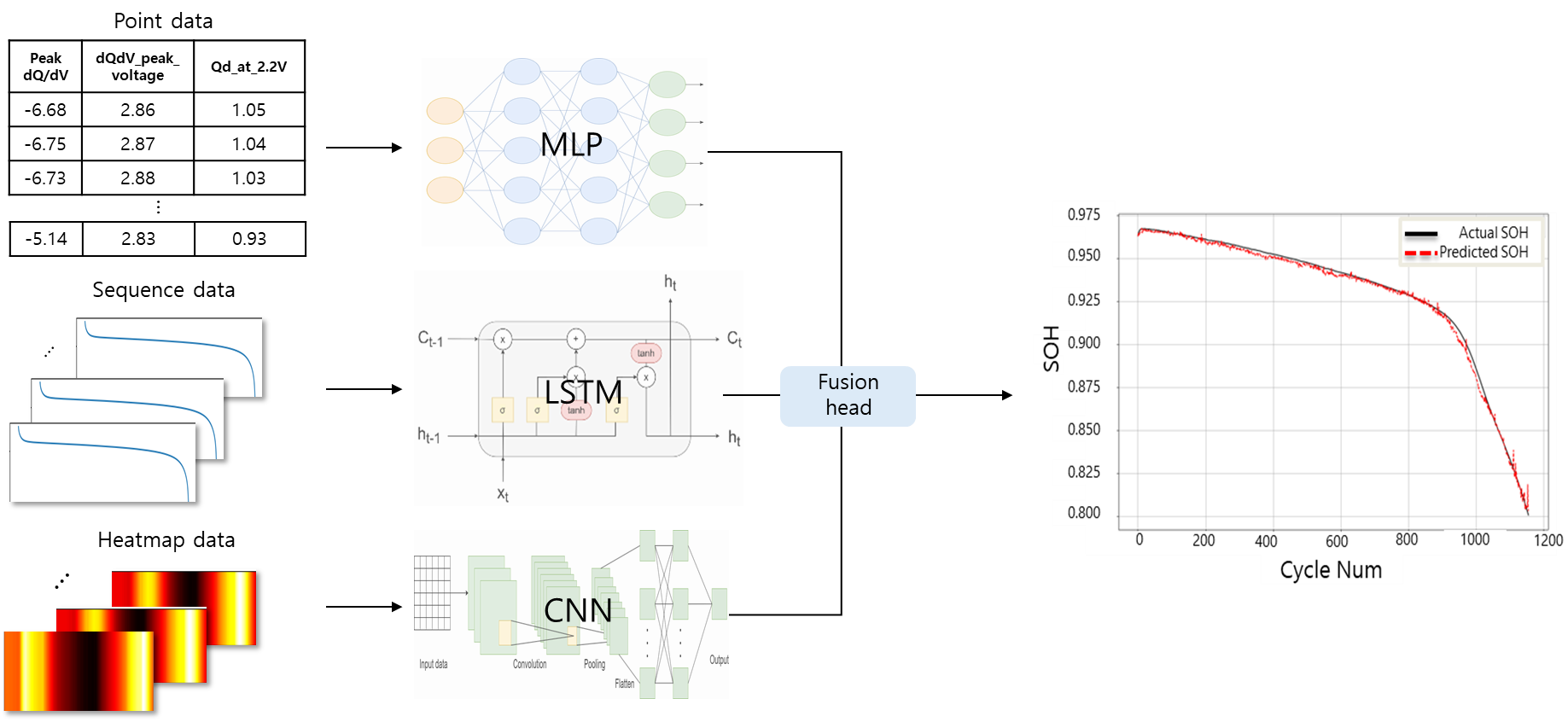 ๋ฐฐํฐ๋ฆฌ์ ์ํ ์ ๋ณด๋ฅผ ์ง๋ ๋ค์ํ ์ผ์ ๋ฐ์ดํฐ ์ ํ์ ์ ํฉํ MLP, LSTM, CNN์ ์ตํฉํ์ฌ ๋ฐ์ดํฐ์ ํน์ฑ์ ์ถ์ถํ์ฌ SOH๋ฅผ ์ถ์ ํ์๋ค. ๋ค์ํ