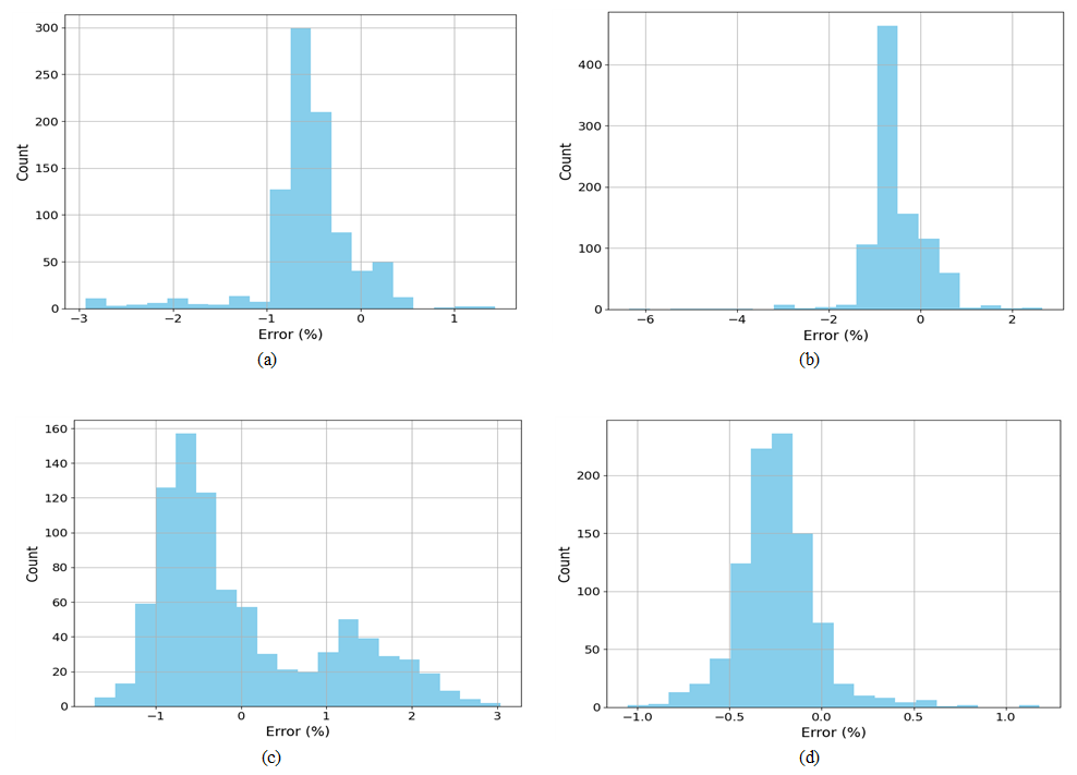 ๊ทธ๋ฆผ 9. SOH ์ถ์ ์ค์ฐจ ๋ถํฌ (a) MLP, (b) LSTM, (c) CNN, (d) MMF