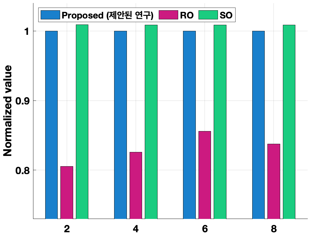 ์์ต์ฑ์ด ํฅ์๋์์ผ๋ฉฐ, $\alpha$๊ฐ 0.8๋ณด๋ค ํฐ ๊ฒฝ์ฐ๋ ์ฝ 18.24~21.49% ์์ต์ฑ ํฅ์ ํ์ธ). ๋ฟ๋ง ์๋๋ผ, ๊ธฐ์กด์ฐ๊ตฌ (SO, RO)๋ค๊ณผ์
