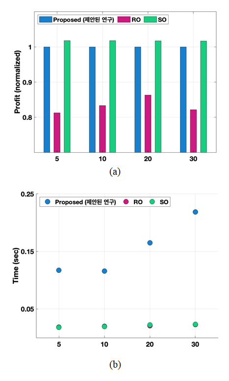 ๊ทธ๋ฆผ 8(a)์ (b)๋ ๊ฐ๊ฐ ์ ๋ ฅ๊ตฌ๋งค ๊ฐ๊ฒฉ ์ํ๋ง ๊ฐ์ [5,10,20,30] ์ ๋ฐ๋ฅธ ์์ต์ฑ๊ณผ ์ฐ์ฐ์๊ฐ์ ์ 2๊ฐ์ง์ ๊ธฐ์กด ์ฐ๊ตฌ๋ค๊ณผ ๋น๊ตํ์๋ค. ๊ทธ๋ฆผ 8(a) ์์๋ ์ ์ํ ์๊ณ ๋ฆฌ์ฆ์ ํตํด ๋์จ ๊ฒฐ๊ณผ๋ฅผ 1์ ๊ธฐ์ค์ผ๋ก ์ ๊ทํํ์ฌ ๋ค๋ฅธ 2๊ฐ์ ๊ธฐ์กด์ฐ๊ตฌ์ ์์ต์ฑ์ ๋น๊ต๋ถ์ ํ์๋ค. ์ด๋, ์ํ๋ง ๊ฐ์๊ฐ ์ ์์๋ก