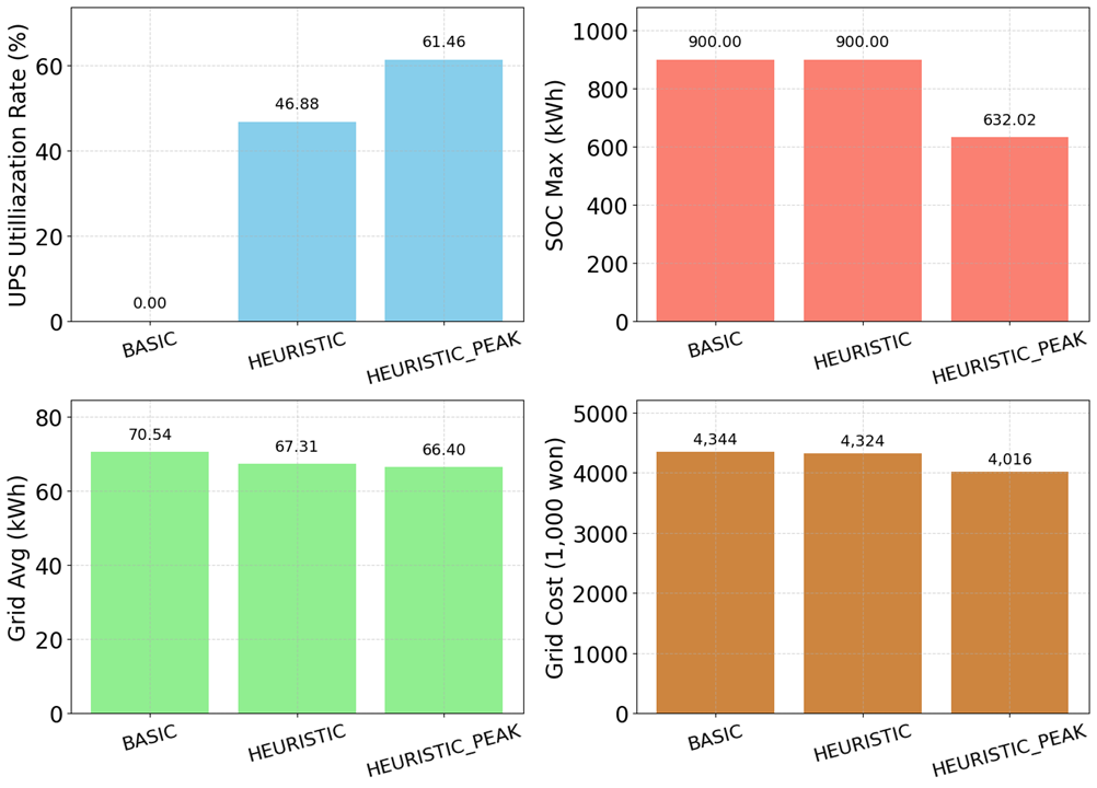 ํตํด ํ๊ฐ๋์์ผ๋ฉฐ, ์ฃผ์ ์ฑ๋ฅ ๋น๊ต ํญ๋ชฉ์ UPS ์ฌ์ฉ๋ฅ , SOC ์์ ์ฑ, ์ ๋ ฅ ๋น์ฉ ๊ทธ๋ฆฌ๊ณ ๊ณํต ์ ๋ ฅ ์ฌ์ฉ๋์ ๋ณ๋์ฑ ๋ฑ์ผ๋ก ์ค์ ํ์๋ค.