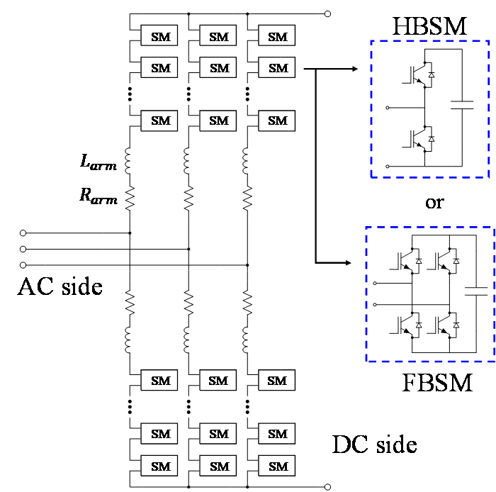 수십 kV의 전압 레벨의 MVDC 배전계통에서의 AC/DC 컨버터로는 주로 모듈형 구조의 전압형 컨버터인 MMC를 이용한다[4]. MMC의 주요 서브모듈(Submodule) 구조로는 스위치 2개로 구성된 Half-Bridge 서브모듈(HBSM)과 스위치 4개로 구성된 Full-Bridge