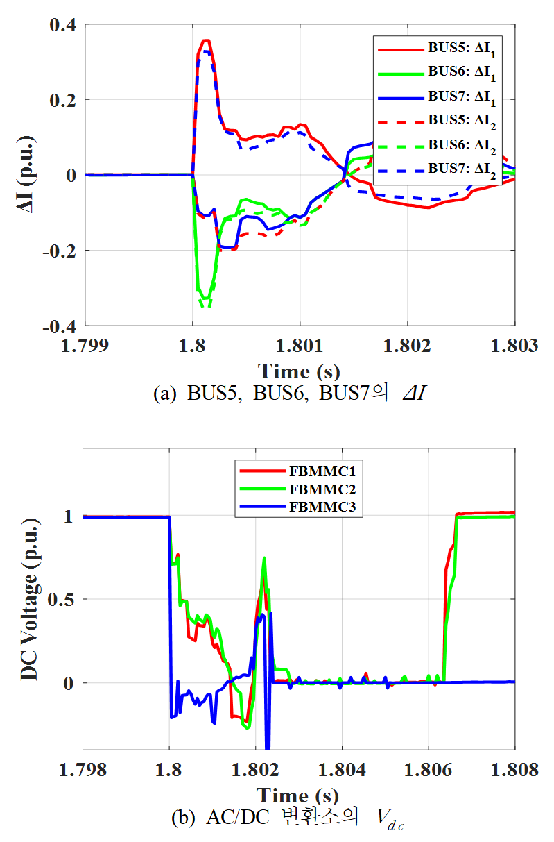 고장 구간 차단 이후 FBMMC의 $I_{dcref}$값이 복귀하여 DC 전압이 회복됨을 그림 9(b)를 통해 확인할 수 있다.