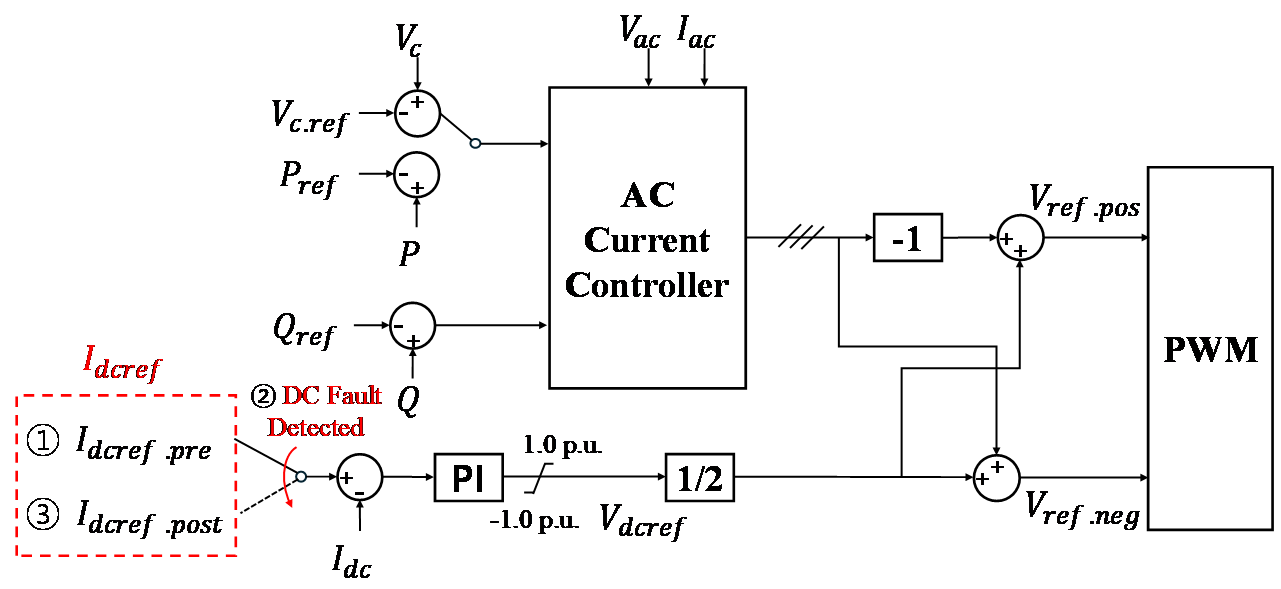 DC 측 고장에 대응하기 위한 FBMMC의 고장전류 제어 시스템은 DC 출력 전류 지령값인 $I_{dcref}$의 스위칭으로 구현된다. 이때 MMC가