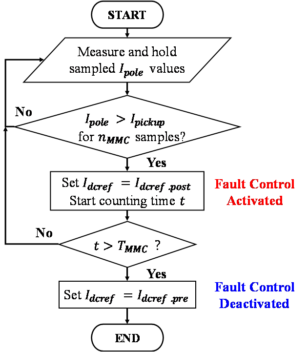 본 연구에서는 AC/DC 변환소에서의 DC 고장 감지를 과전류 감지로 설정하였고, 시간 $T_{MMC}$ 이후에 다시 복귀하도록 하여 고장 제거 이후
