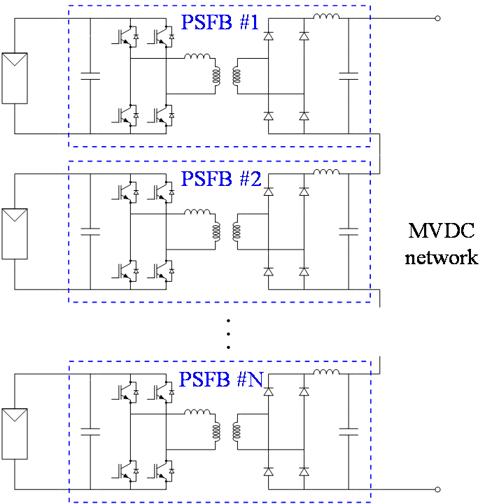 따라서 PSFB 컨버터 역시 컨버터의 고장전류 기여도를 낮추고 자체 보호에 용이한 특성을 갖는다. MV 레벨의 전압에 대응하기 위해 컨버터 여러 개를