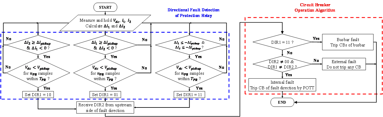 그림 7. MVDC 배전계통의 방향성 고장 탐지 및 고장 구간 차단 알고리즘의 플로우차트