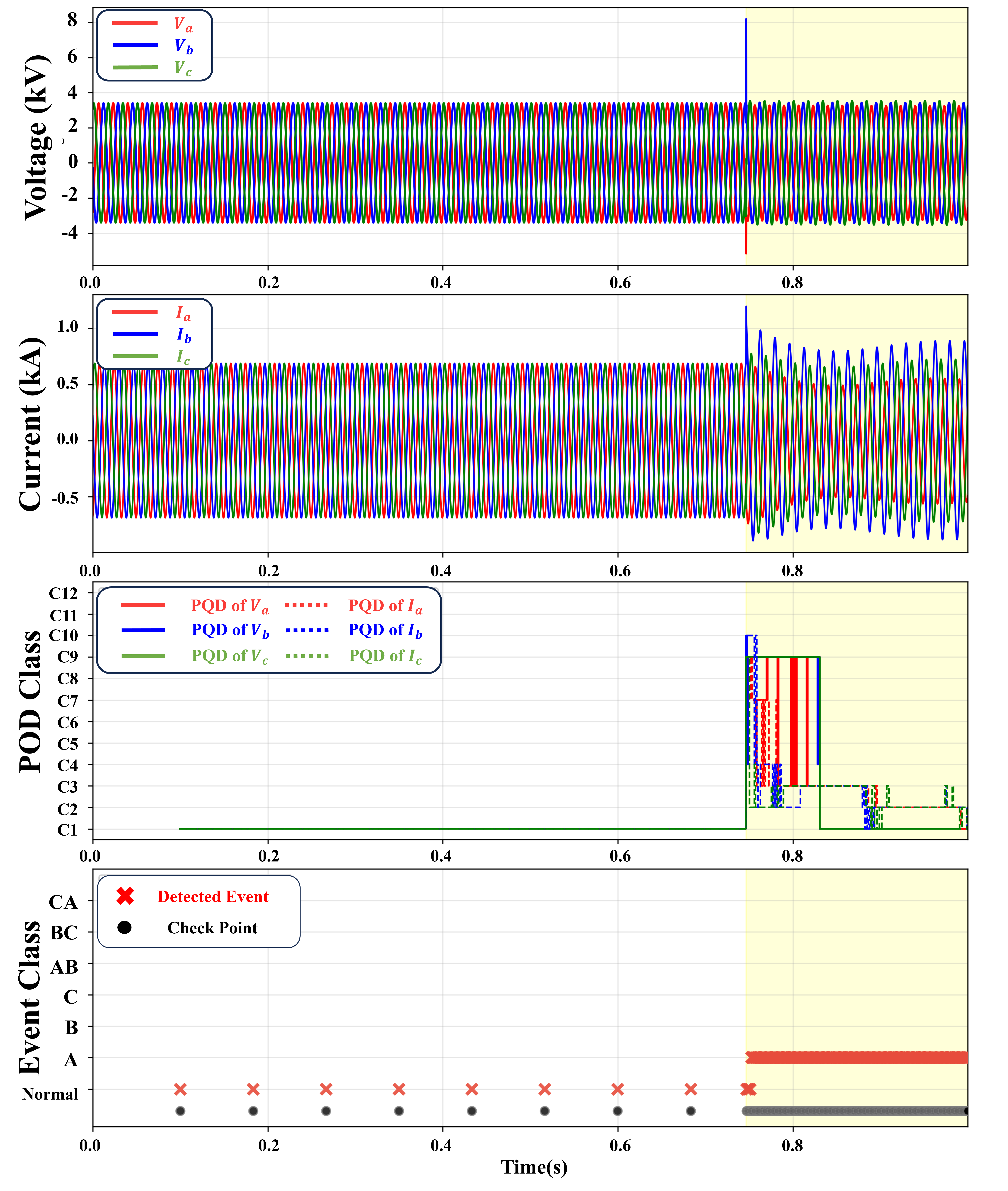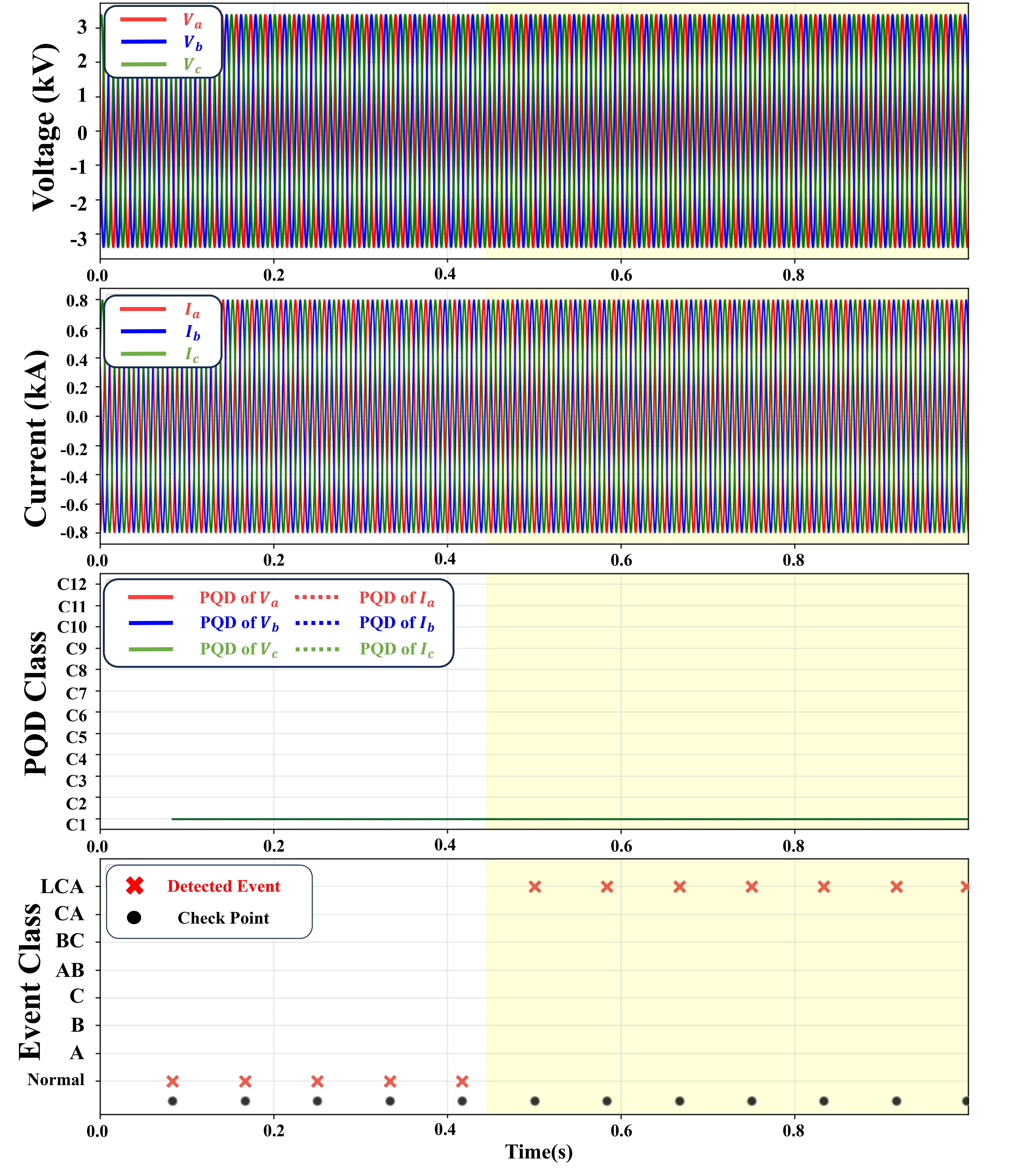 부하 모선에서 계측한 3상 전압 및 전류 시계열 데이터를 기반으로, 5주기(83.33ms) 길이의 슬라이딩 창을 적용하여 PQD를 감시한다. 이후
